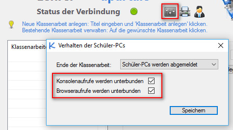 Sollte die Deaktivierung des Internets aus technischen Gründen nicht möglich sein, kann der Lehrer für seine Klassenarbeiten Aufrufe von Konsole und Browser automatisch unterbinden. Die Einstellungen dazu finden Sie wie hier abgebildet.